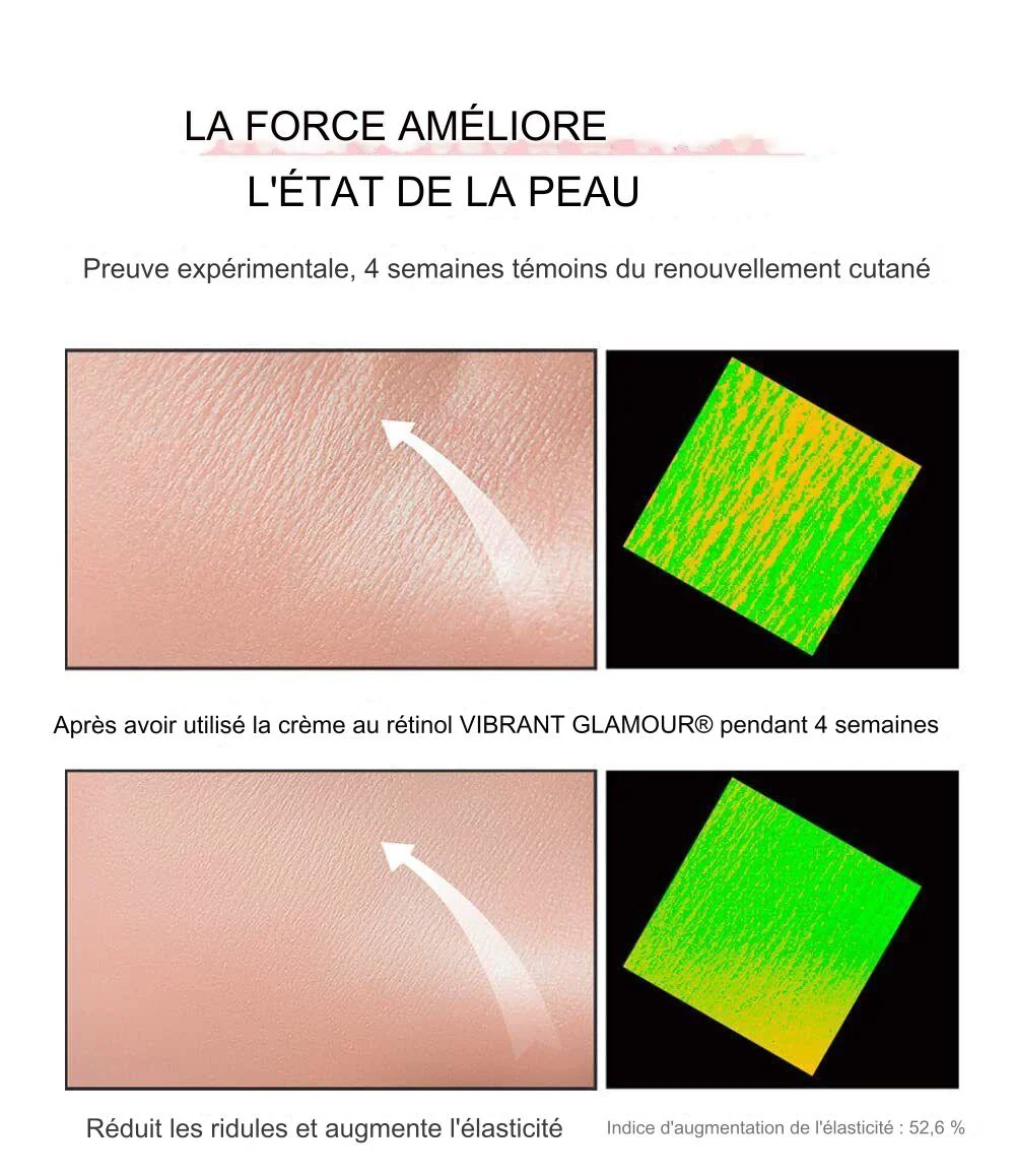 La Crème Rétinol Vibrant Glamour est un joyau de l’anti-âge, créé pour réduire visiblement les rides et revitaliser votre teint. Enrichie en rétinol, cette crème puissante agit en profondeur pour stimuler le renouvellement cellulaire, laissant votre peau plus ferme, plus lisse et radieuse.